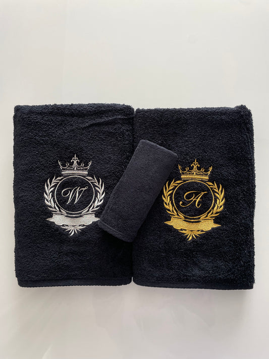 Black Bath towel set with initials / Monogrammed Towels / Embroidered antique gold initials