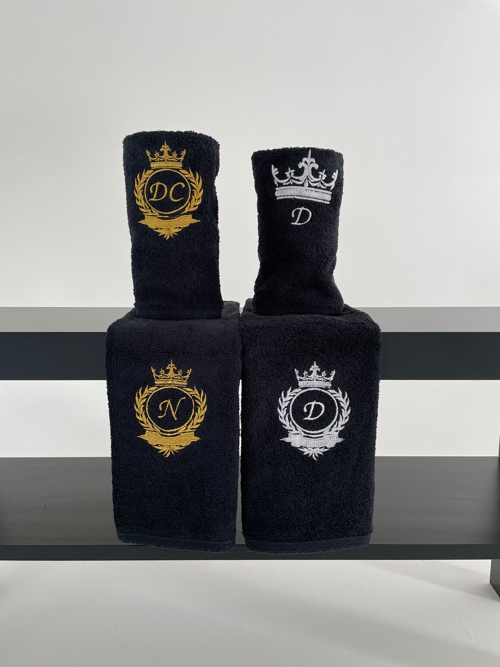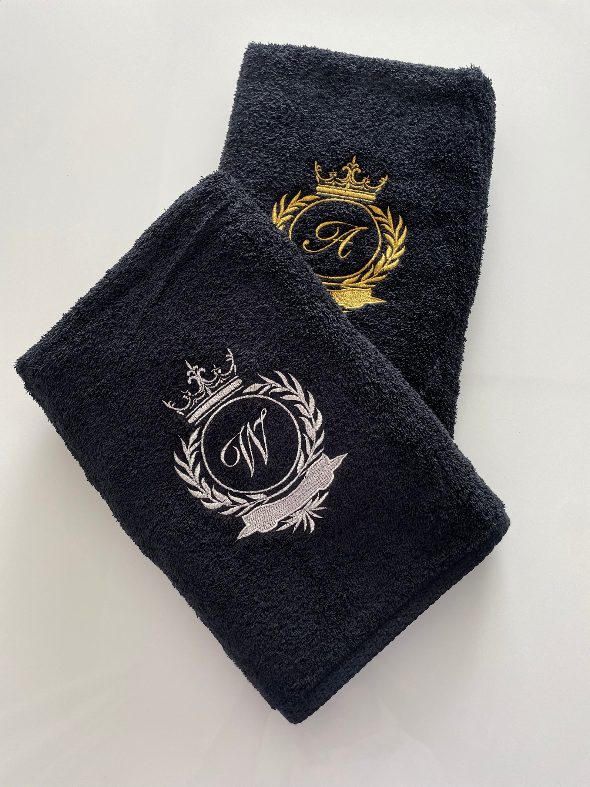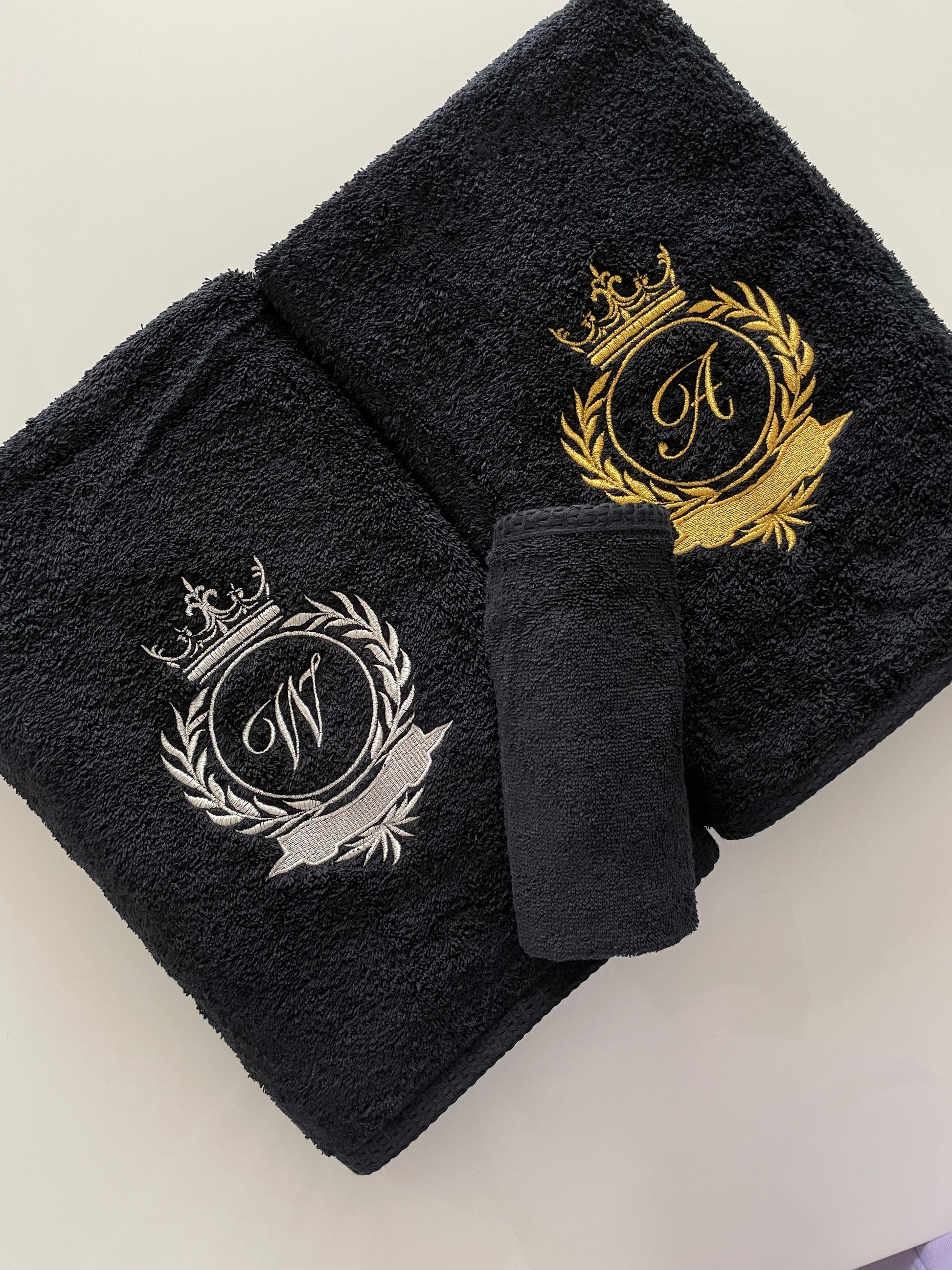 Black Bath towel set with initials / Monogrammed Towels / Embroidered antique gold initials
