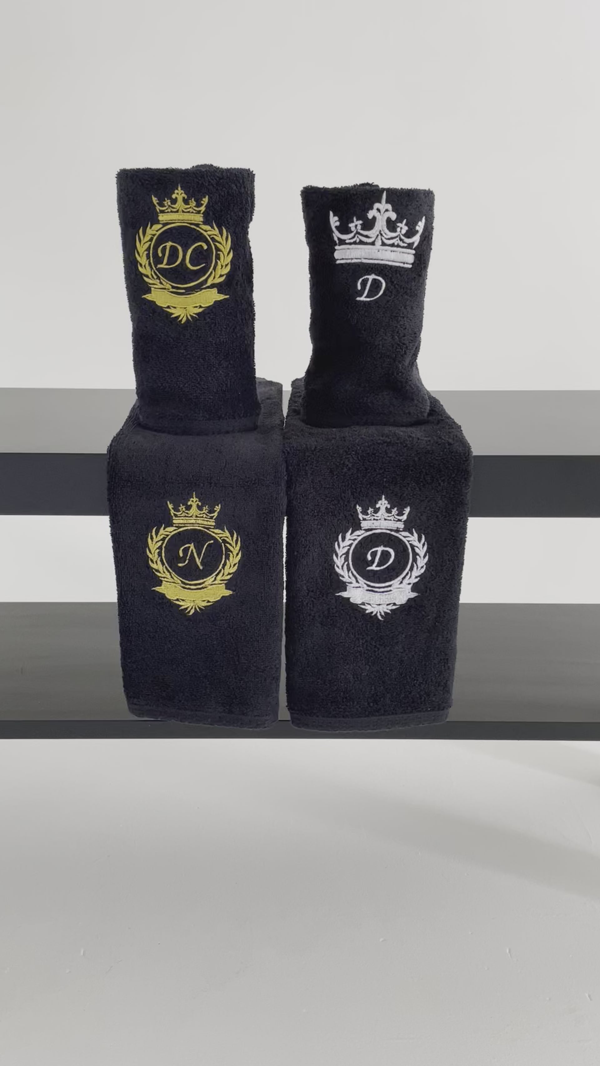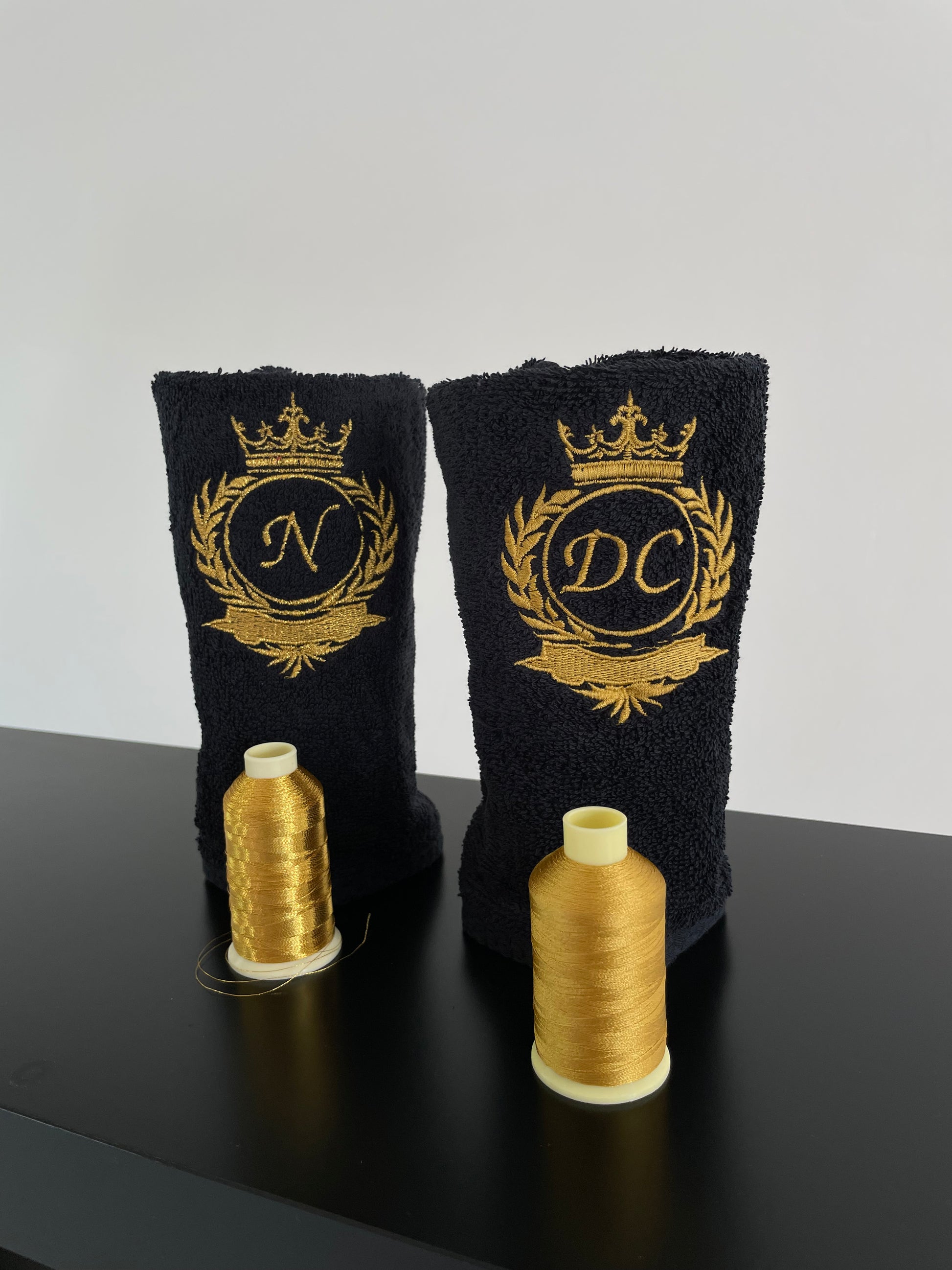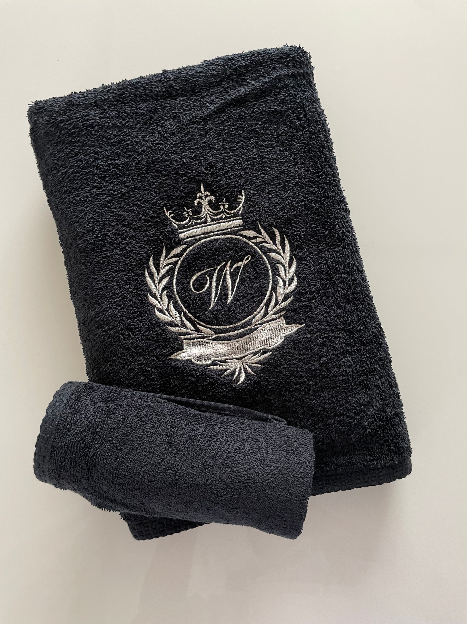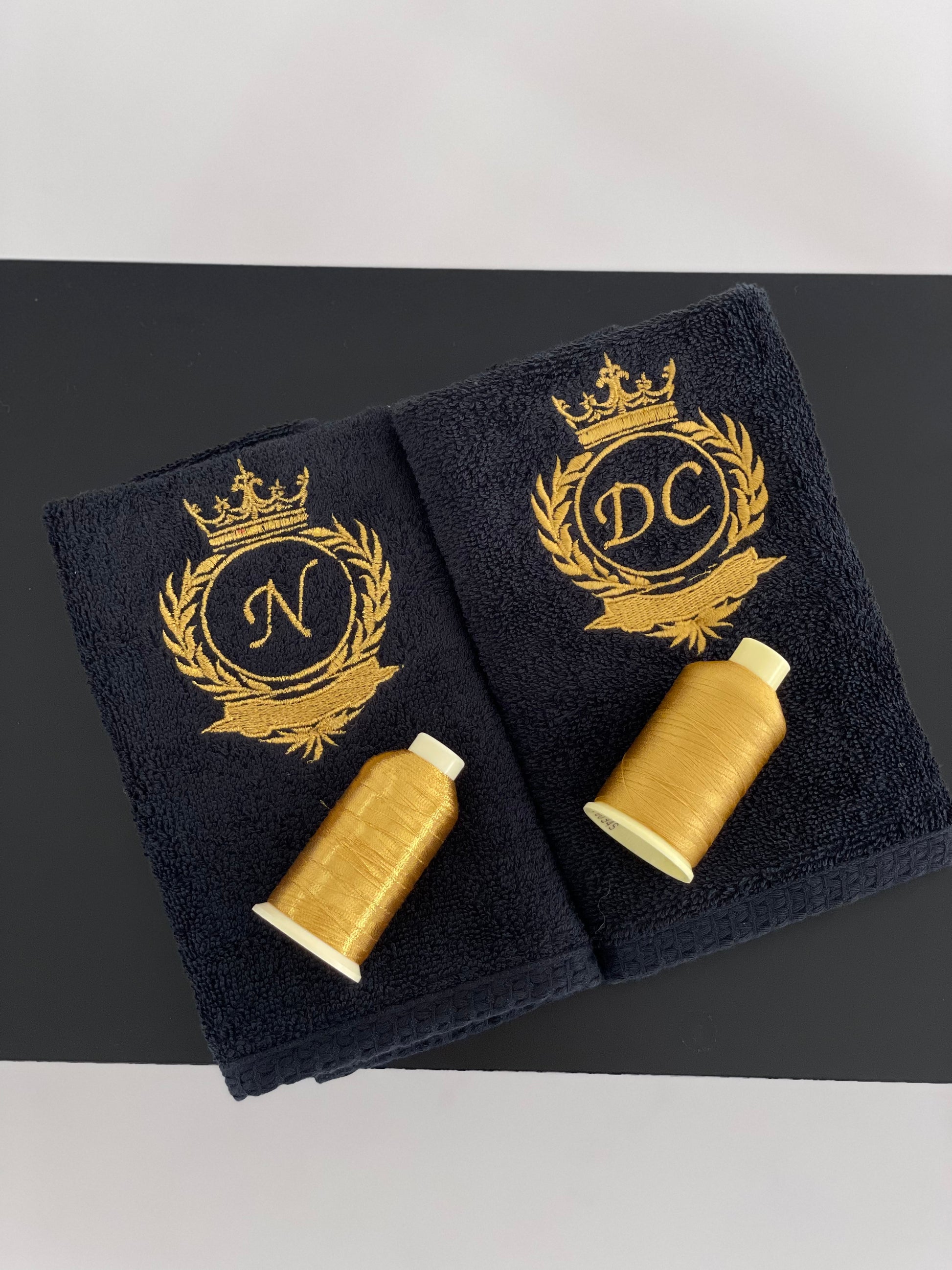 Black Bath towel set with initials / Monogrammed Towels / Embroidered antique gold initials