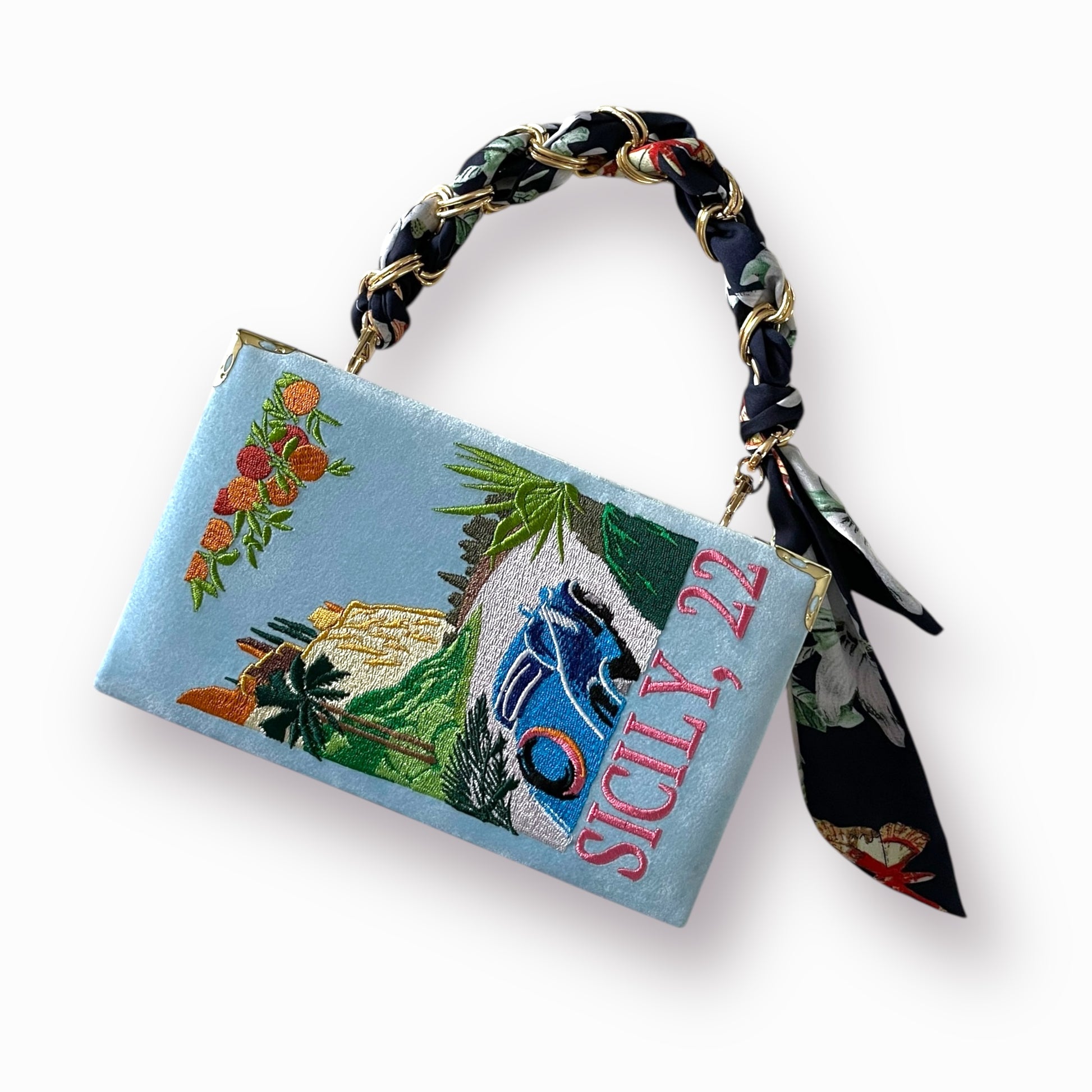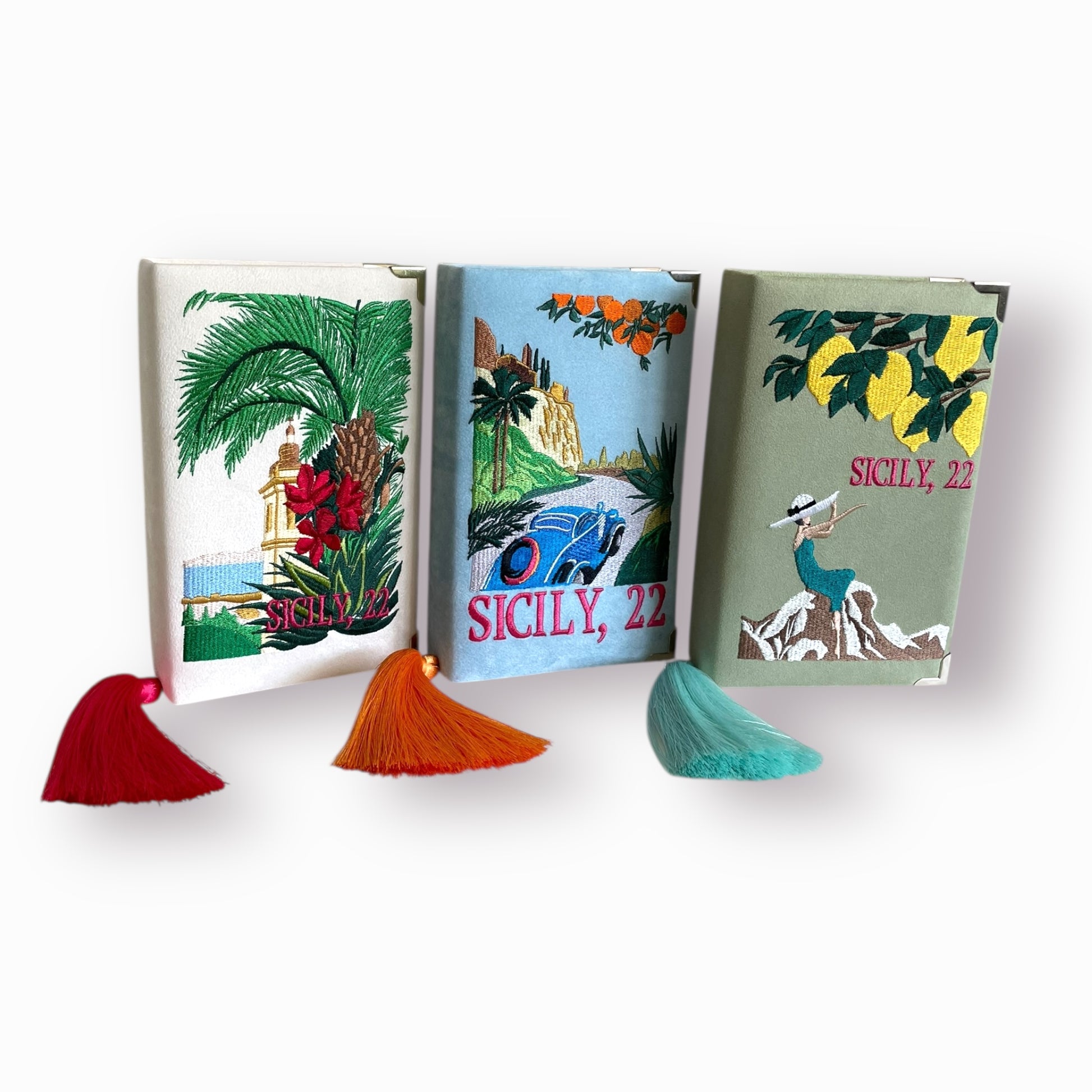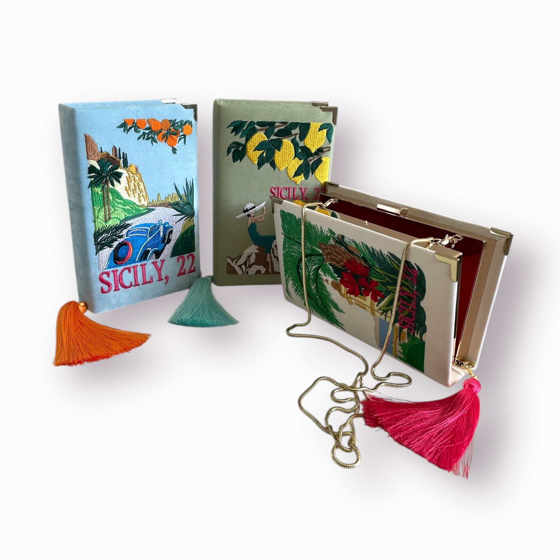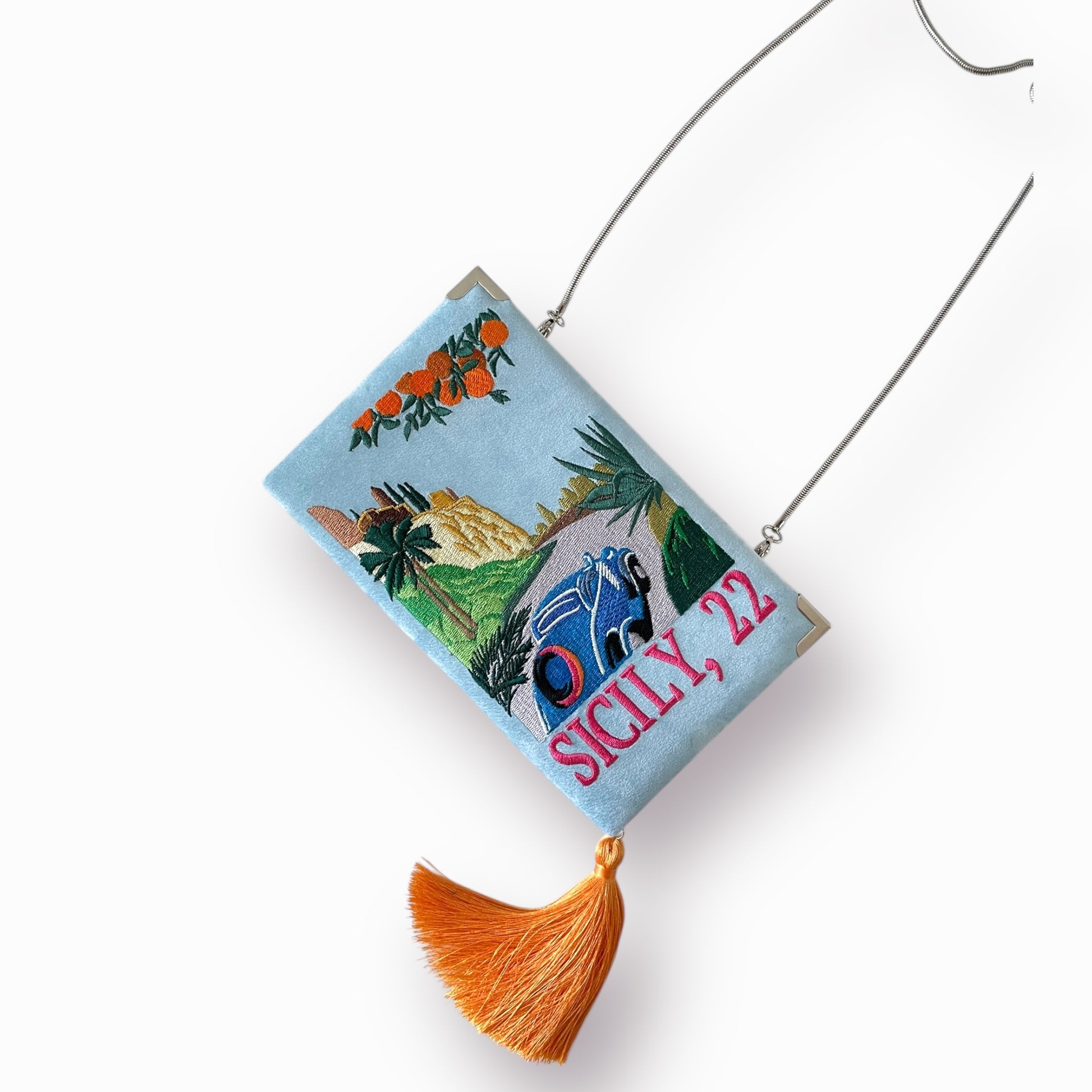 Book clutch purse, embroidered Voyages bag, crossbody, Sicily