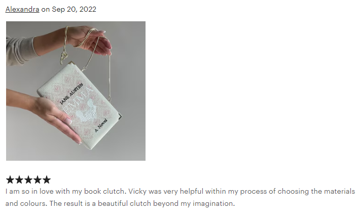 I love my new book/purse. It's beautiful I will be ordering more. Thank you.